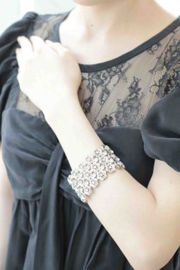 黒レースでジャンプスーツとリンクした ビジューとグレーサテンのコサージュを