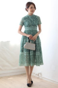 ハイネックデザインとミディ丈のFit&フレアのデザインがクラッシックで上品な雰囲気。ミントグリーンの総レースが爽やかで華やかな印象です。スカートのボリューム×長さも上品な雰囲気。しっかりお袖もあるので一枚で安心して華やかなドレスアップstyleになります。