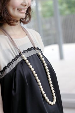 FantaDressオリジナルのベージュシフォンコットンパールネックレスをコーデの主役に。