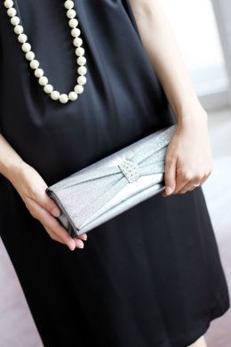シルバーグレイのクラッチBagは、黒ほど重くなり過ぎず、 コーデが華やかにしまります