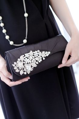 クラッチBagはジュエリーにもあう正統派ブラックビジューを合わせて。