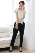 トップスのウエスト部のリボンでサイズ調整ができ、緩めにもタイトめにも、また前・後どちらでも結べるのでお好みのシルエットをおつくり頂けます。首まわりはしっかりとあって上品な印象でありつつ、背中にはボタン下にほんのり空きがあり、そのバランスも秀逸、お袖もあるので安心してお召頂けます。パンツはベアトップ風のデザインでウエストの中紐でサイズ感の調整できます。