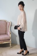 トップスはやわらかな素材で着心地◎。肩全体をレースがカバーしつつ、透け感がフェミニンな印象です。パンツのウエストはゴム仕様で伸縮性がありトップス同様着心地抜群!またポケットがあるので、使用頻度の高いティッシュなどを忍ばせておくことも可能です。