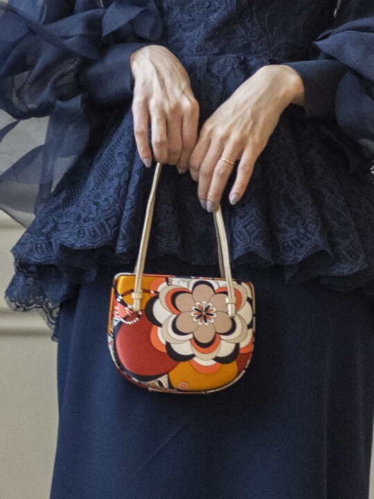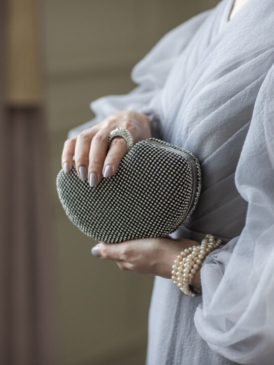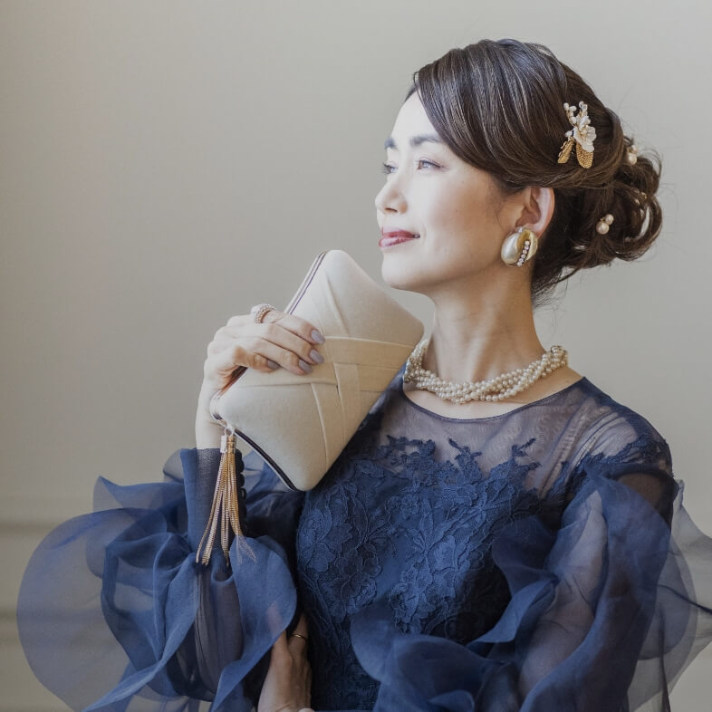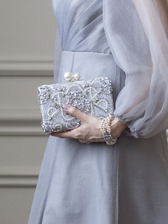 ドレスのシルエットや素材感との調和を大切に、フォルム・質感・色味すべてにこだわってセレクトしています。写真にも映え、他ではなかなか出会えないような一品を。大人の上品さと、モダンな洗練を宿すバッグで、トータルドレスアップを完成させて。