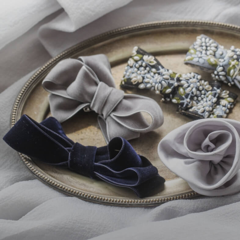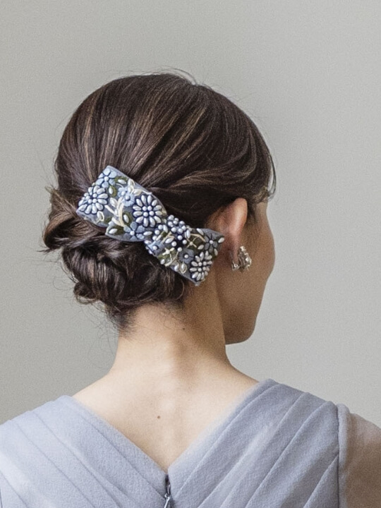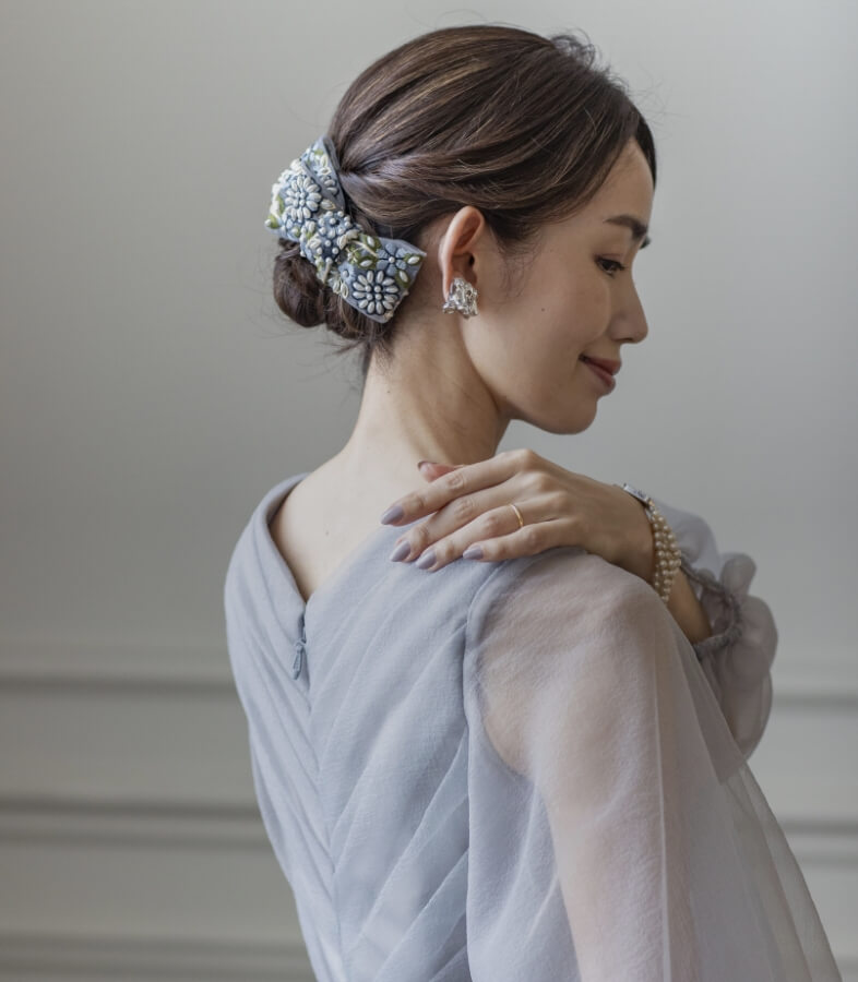 「リラ透羽」「翠凛」の世界観に合わせて仕立てた、大人のためのリボンヘッドドレス。インド刺繍や和の伝統刺繍を繊細に取り入れ、和と洋が美しく調和する特別なひと品です。甘くなりすぎず、上品な華やかさをそっと添えるデザインは、ドレスとともに身につけてこそ完成する装い。リボン以外のヘッドアクセサリーもご用意し、トータルで調和のとれたコーディネートをご提案します。