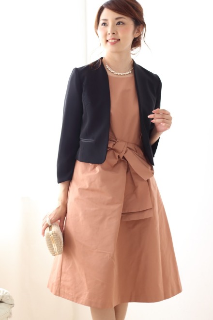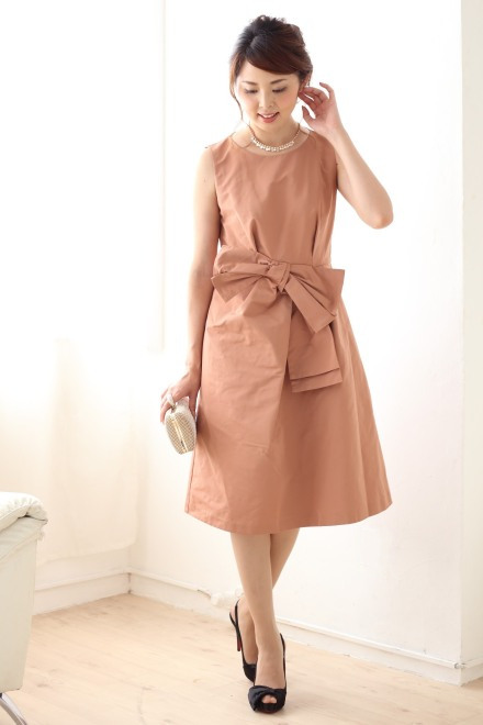 ウエストの大きなリボンがポイント、シンプルなラインが美しいミディ丈ドレスです。生地の張り感が豪華で上品な印象も。バックスタイルの黒の水玉模様のテキスタイルもチャーミングです。上に羽織るもので印象もぐっと変わります。