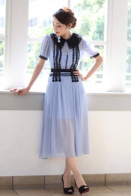 | その他 | 背中のファスナーで着脱します。生地の伸縮性はなく細身のデザインとなります。(普段7号~細目9号サイズの方にお勧めいたします。モデルのサイズ、またドレスの実寸サイズをご確認ください)「Self Portrait」のデザインの特徴は上品な透け感。バストの部分だけベージュの裏地がついています。モデルはその状態で着用しており、問題はないかと思います。またスカート部分の裏地も短めとなっており、ひざ上からほんのり脚が透けて見えます。しっかりスカート丈がありますので、そこがデザインの軽やかさのポイントとなりますが、もし脚の透け感が気になられる場合は一緒にお送りする裏地と同じ色(薄い水色)のペチコートをご着用ください。 |