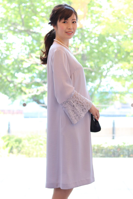 ゆったりしたシルエットで、生地感も軽く着心地のよいドレスです。お袖がしっかりあるので、羽織などはなくてもOK。スカート丈もひざ下の安心感があります。また、ポケットがついているので、ハンカチなどを忍ばせておくこともできます。