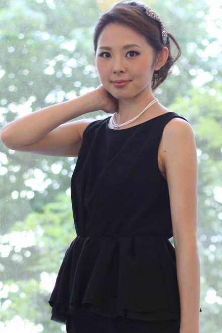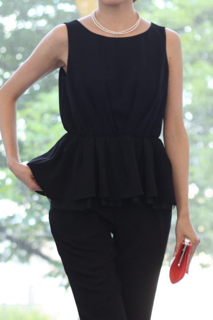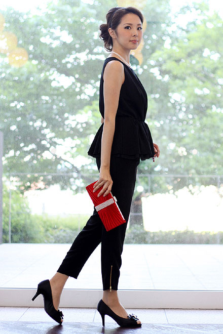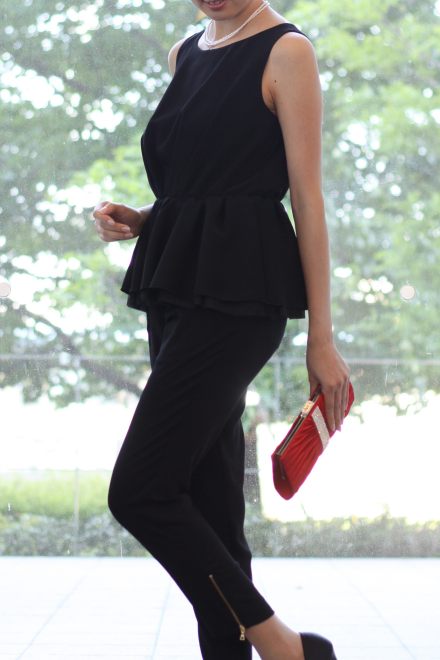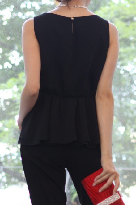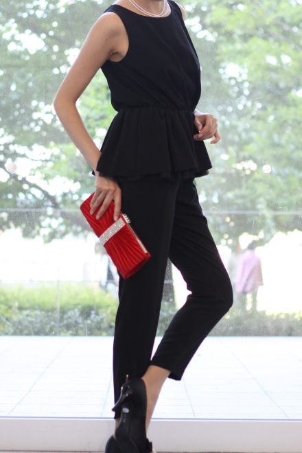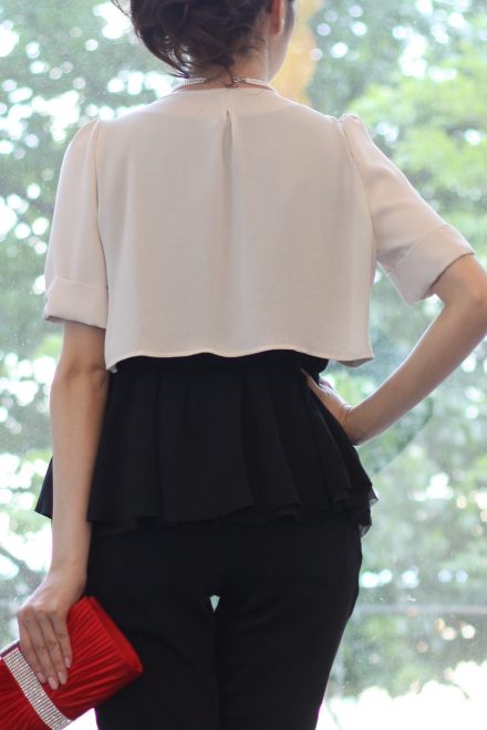 トップスはシンプルなネックラインでウエストの切り替えからふんわり広がるデザインがポイントに。パンツのウエストにはゴムがあしらわれており履き心地もスタイルも抜群です。ブラックセットアップの上下だとオトナ可愛いDRESSアップに。オフホワイトのボレロ風ジャケットを合わせると上品に安心感のあるDRESSアップスタイルになります。