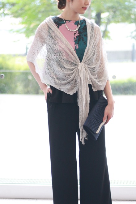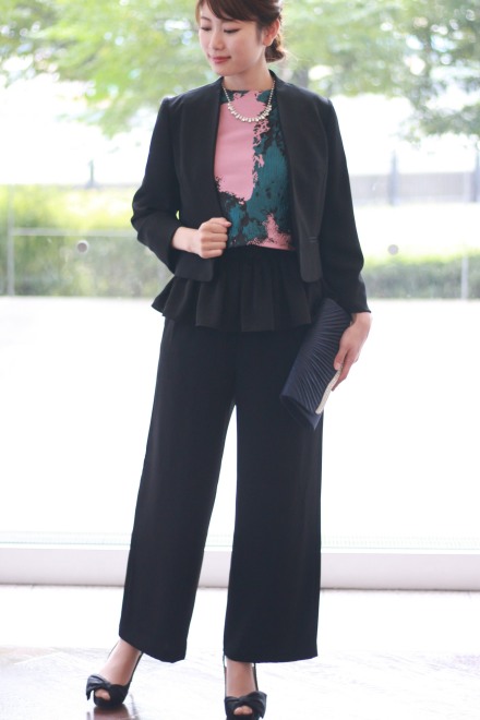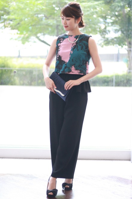 オールインワンはバックファスナーで着脱し、ポケットもありとても動きやすいstyle!ブラウスはスナップで着脱。簡単に羽織るだけでこんなにも雰囲気が変わる…ワイドパンツも新鮮で、今までにないパンツstyleのドレスアップです。ハイヒールでオトナっぽく、またフラットシューズでもお洒落な感じでステキです。