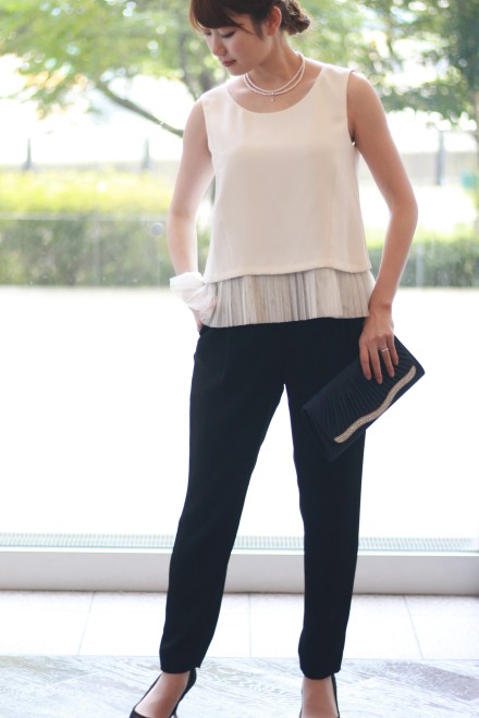 ラインがとても美しいパンツは、ウエストの一部がゴムになっており、履き心地も抜群。トップスもスッキリしたシルエットで、プリーツのペプラムが華やかな印象です。トップスはお色違いでブラックもあり、オールブラックだとさらにクールなパンツセットアップスタイルに…!(ブラックのご希望もお承りいたします)