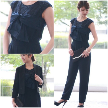 クール過ぎず、甘すぎず…ネイビー×パンツstyleってちょうどいい華やか感が…。このMylaはとってもスッキリしたオールインワンのパンツstyleなんだけど、トップスのデコルテ部分のレースがとっても華やかで、フロントのリボンがクールネイビーに甘さを加えていてそのおしゃれ感がとても絶秒なのです。ダークカラーのパンツstyleってどこかにポイントとなるデザインがなければ少し地味な印象になることもありますが、ネイビーカラーでこの上品な華やか感があるのでとっても安心のパンツドレスアップに!