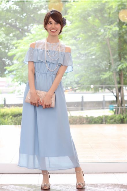 モデル身長162cm。さわやかな水色がすっきり&フェミニンな印象。このドレスはトールさんが着るとアンクル丈となり、足元の透ける感じが軽やかに。デコルテのレール感と、オフショル、ノースリーブの2Wayの着方も楽しんでくださいね。クールテイストのお色違いネイビー