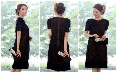 モデル身長162cm。着丈98㎝と、ドレスとしては長め丈です。ほぼストレートなデザインとブラック効果で、スッキリしたシルエットに。(それでいて身頃幅87~90㎝あるのでゆったりしています)ブラックに見えて実は繊細なレースから透けるキャメルブラウンのニュアンス感がまた上品なドレス。
